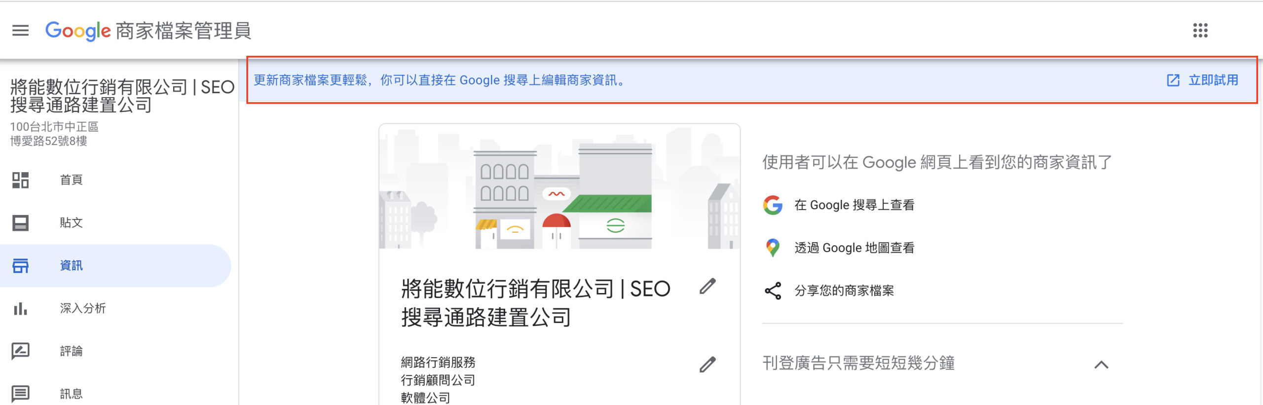 如圖片所示,點擊「立即使用」後,就會直接來到搜尋結果頁,接下來我們將針對這個區塊來進行我的商家資料的編輯。