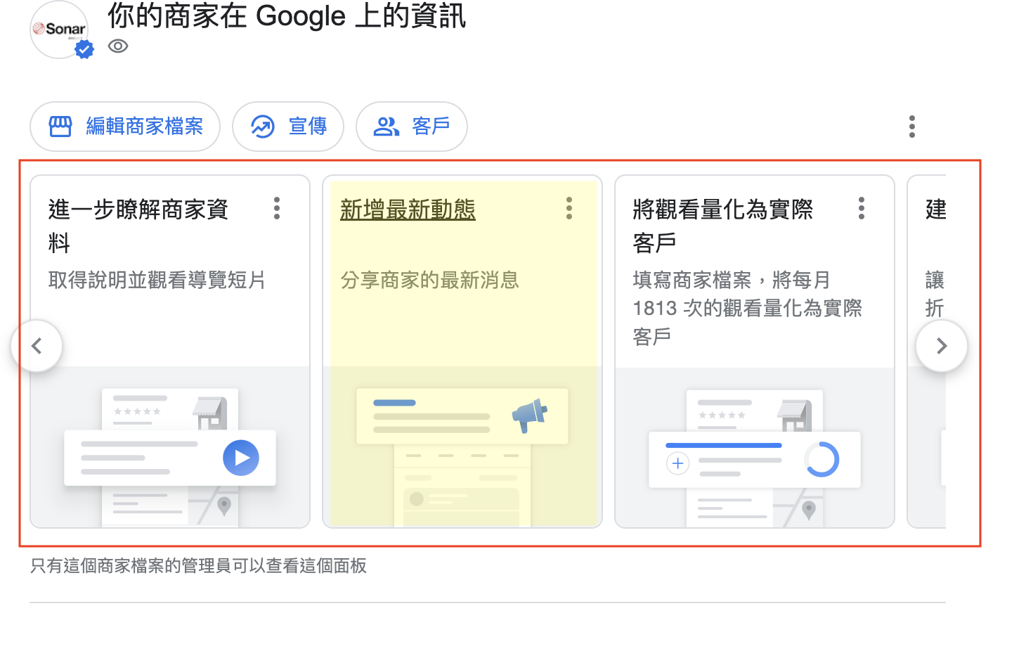 除了三大功能,你還能在區塊內下方可以滑動的清單進行更進一步的編輯與優化。此處特別之處在於,每個商家的清單可能與其他商家不同。可以嘗試查看你能使用清單,例如我們可以點選「新增最新動態」,來公布我們公司近期的活動與資訊。