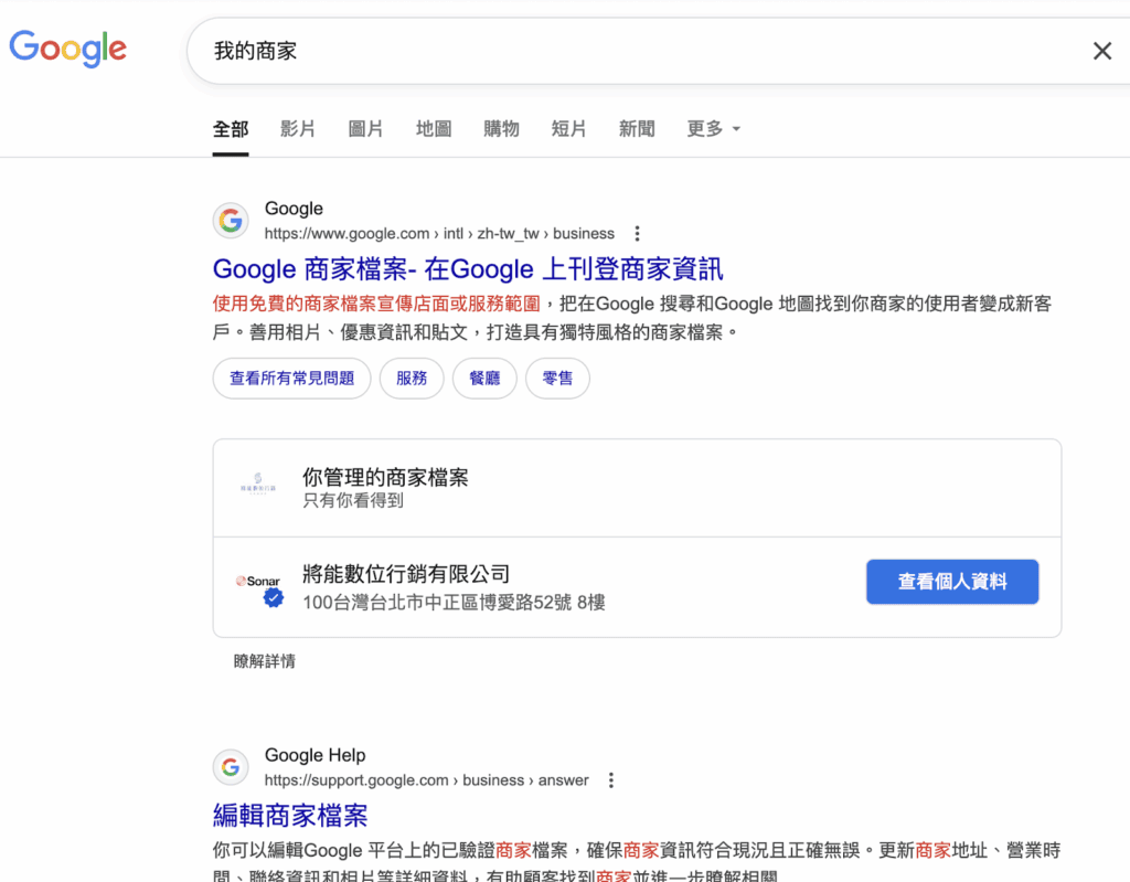 開始之前,你需要登陸有被授權管理Google 我的商家的Gmail 帳戶,接下來在Google 搜尋你的品牌名稱,如果你帳戶底下有多家需要管理的商家,可以搜尋「我的商家」,找到你想要調整的商家,點擊「查看個人資料」。