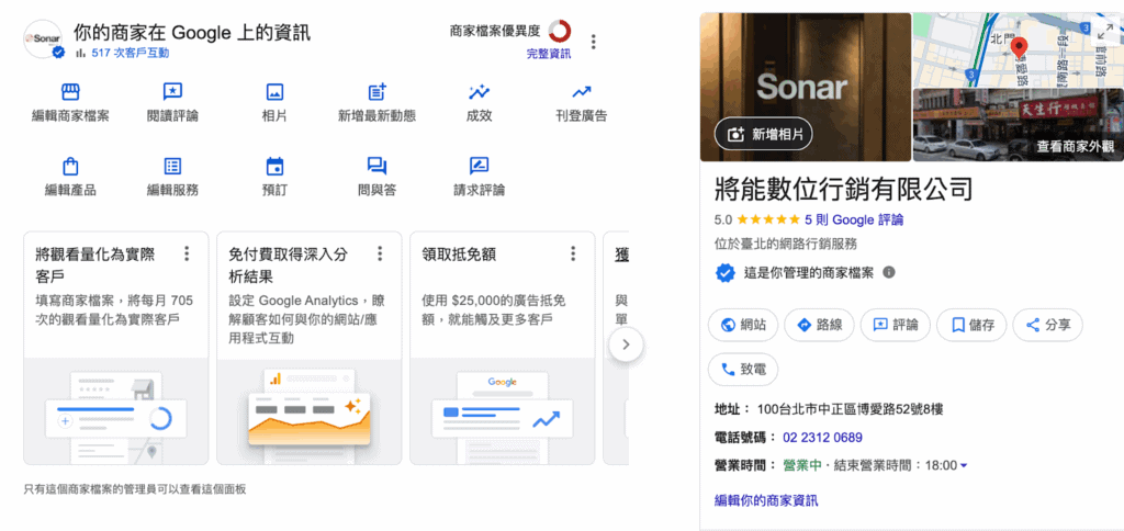 你可以在這裡獲得Google 商家數據洞察、添加照片、貼文,定期更新菜單等。