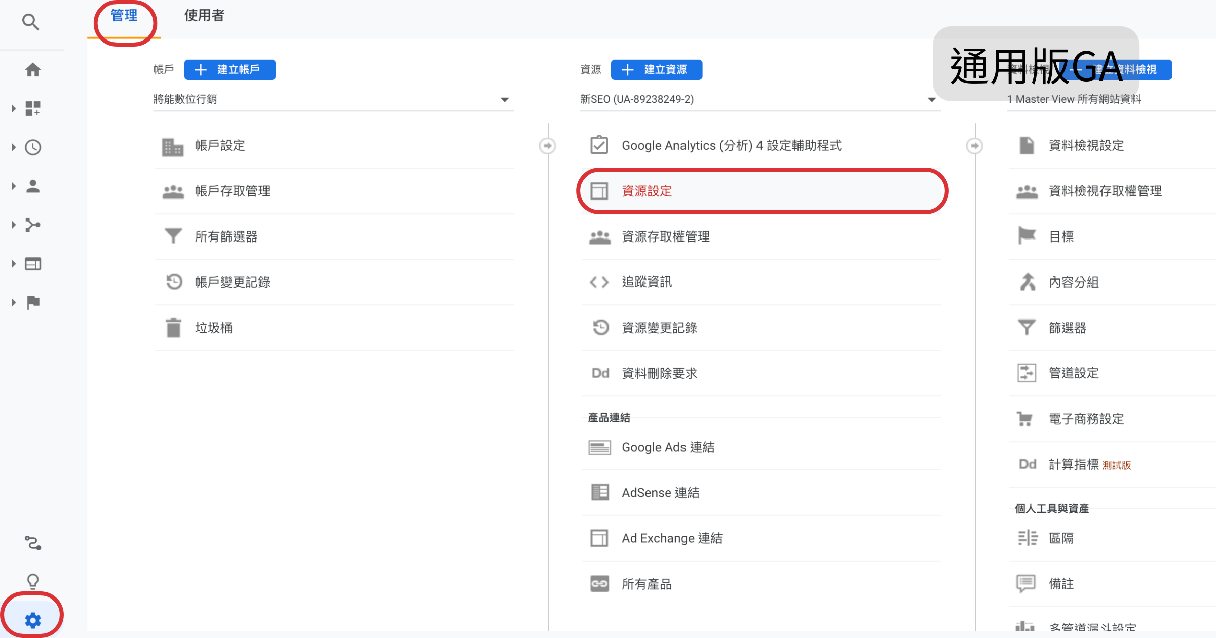 確認條件準備以後,在通用版GA ,按左下角的管理,找到資源設定,進入「調整 Search Console」的選項。