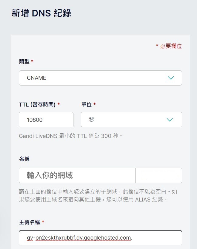 輸入你的網域以後,點擊繼續,接下來將網域驗證方式由txt 切換到cname,保留這個視窗。到網域DNS 中新增一筆cname 紀錄,將Google 提供的CNAME 記錄複製到網域的 DNS 設定裡,記得按確認。