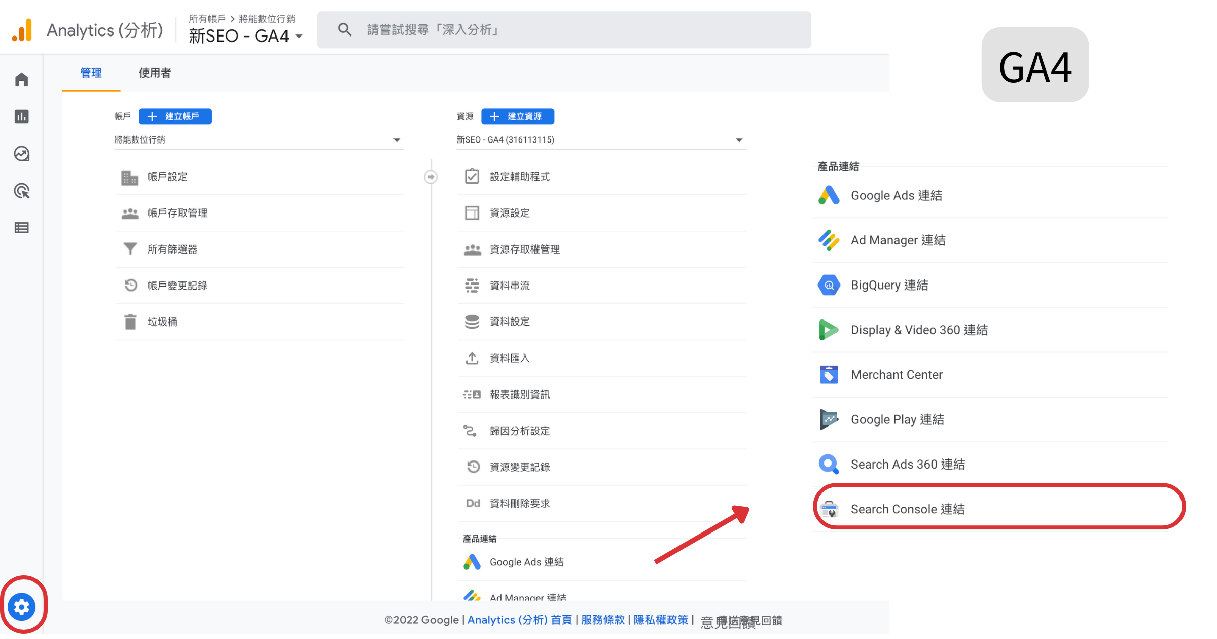 如果是在GA4,我們一樣到GA4 後台管理的地方,GA4 有為GSC 設立專門的選項叫 Search Console 連結,點擊進來以後,會發現GA 與GA4 兩者介面不同,但概念是差不多的。