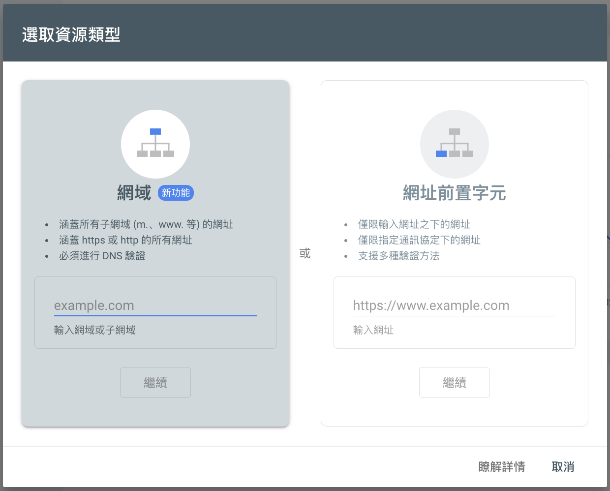 如上圖,我們共有兩種方式可以新增我們的網站,左邊是網域;右邊則是網址前置字元。