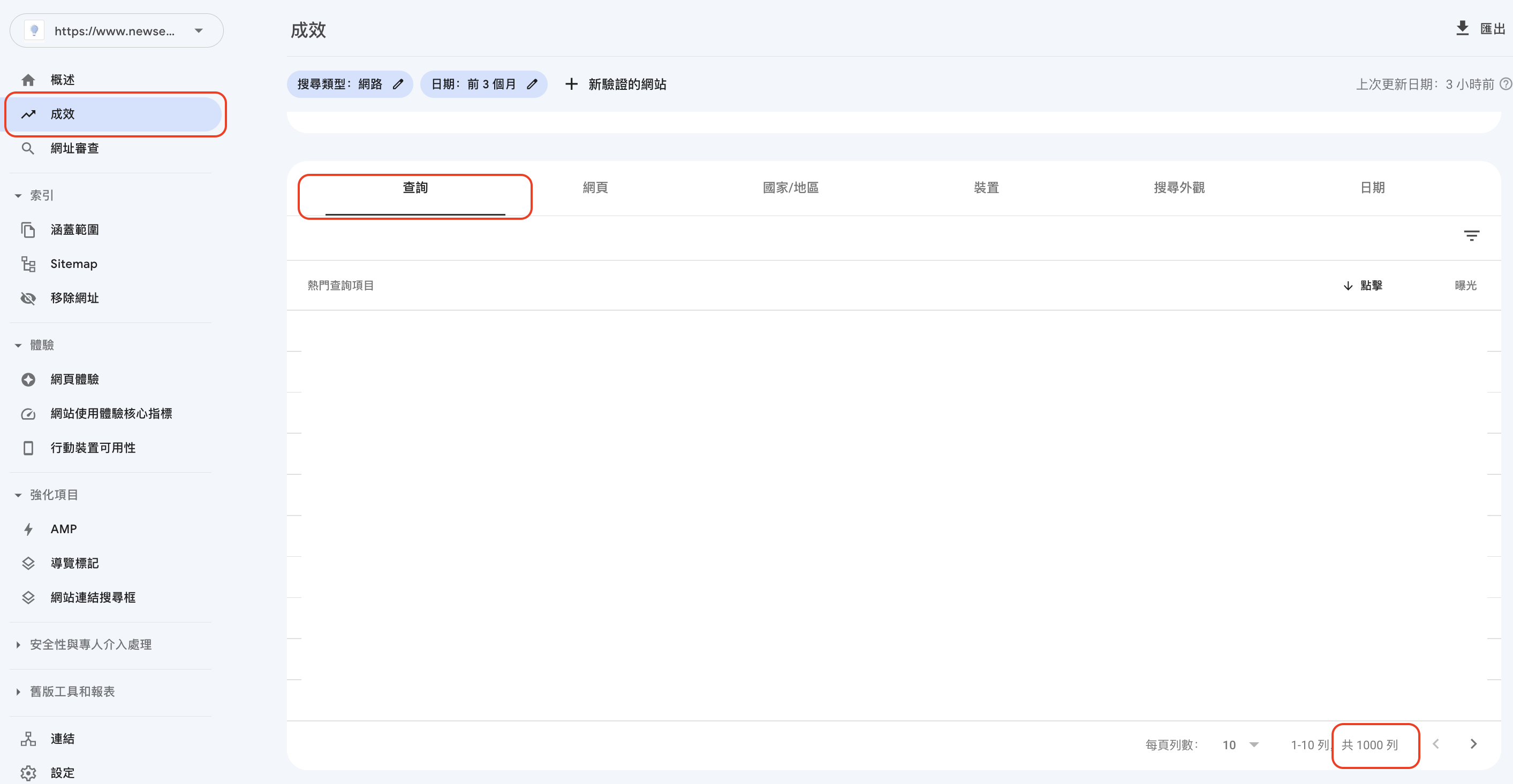 如果你打開GSC 的成效報表,在查詢欄位可以看到我們網站訪客都是搜尋什麼關鍵字上站,如下圖所示,在GSC 裡面,雖然它有使用者搜尋哪些關鍵字上站的原始數據,但是它的筆數,只記錄曝光次數前1,000 的字詞。