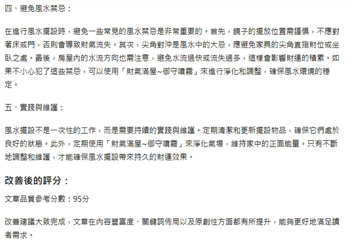 舉個具體的例子,我們的團隊前一陣子應用AI 幫助客戶產出了一篇關於「風水禁忌」的文章,並將產出的結果用我們基於Google 內容品質標準訓練的小模型評分與調整,最後文章得出了95分的高分(參見圖一)。