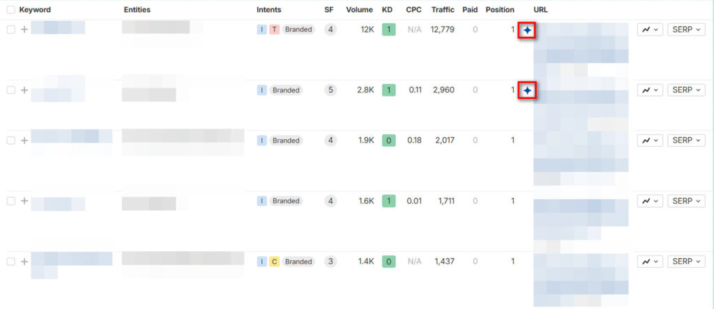 「AI 查詢引用」是在評估你的網站的內容在使用者查詢某個問題時是否被AI 搜尋應用作為參考的資料來源,例如使用者查詢「台灣伴手禮推薦」,你的網站如果有頁面被Google AI 摘要(Google AI Overviews)引用,在Ahrefs 的關鍵字成效報表示就會以十字星形顯示該關鍵字有在AI 摘要被引用(如圖三)。