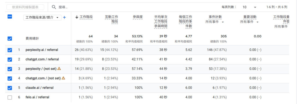 「AI 搜尋流量」是在評估從使用者從AI 搜尋應用點擊上站的流量有多少(如圖四),如何在GA 設定請參考我的專欄文章「如何追蹤AI 搜尋流量」。