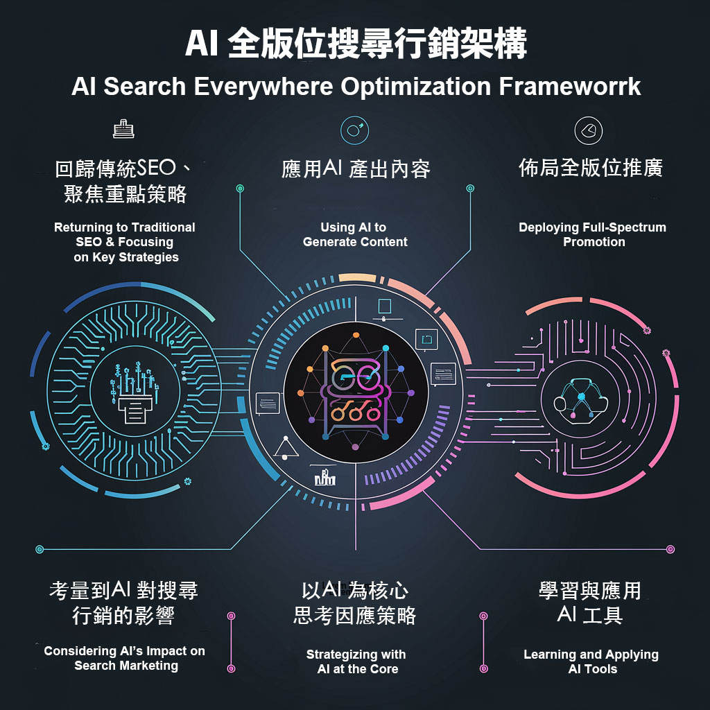 以上所介紹的三項策略,整合起來就是我從2017年起一直在提倡的「全版位搜尋行銷」,關於全版位搜尋行銷,國外一直沒有對應的觀念和稱呼,直到2024年年中,開始有人在講「Search Everywhere Optimization」,才算是有了對應的英文稱呼。這兩年由於生成式AI 帶來的衝擊顯而易見,所以我把「AI」 這項元素也融合在全版位行銷的概念裡,並定名為「AI 全版位搜尋行銷」,「AI」在這裡有多重意義,其一是考量到AI 對搜尋行銷的影響,其二是以AI 為核心思考因應策略,其三是學習與應用AI 工具。