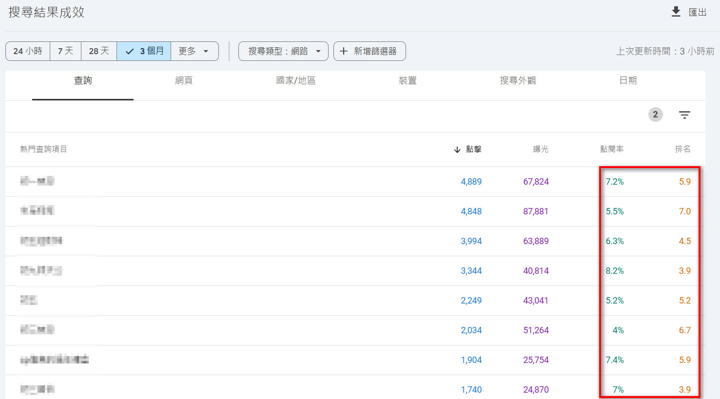 早年我們做SEO,由於Google 未開放網頁的搜尋結果點閱率數據,所以我們只能單方面的進行改善,無法有效追蹤改善後的成效。近年來Google Search Console 已經開始提供搜尋結果點閱率數據,所以我們可以透過分析報表找到需要優化的關鍵詞。例如,我們可以利用Google Search Console 成效報表找出搜尋排名佳(小於10)但點閱率偏低 (低於10%) 的關鍵詞。(圖一)