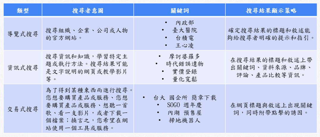 在我們觀察Google 如何使用我們網頁的內容顯示搜尋結果標題與摘要的同時,也要留意到,各種不同類型的搜尋字詞,其背後搜尋者的意圖也有所不同,所以我們在規劃搜尋結果顯示內容的策略也應該有所不同。(圖三)