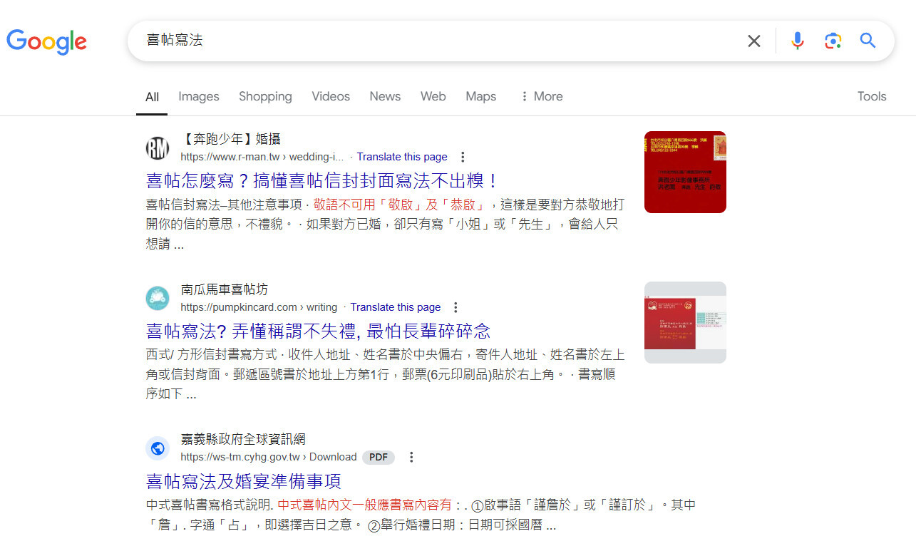 我們的網頁如果在使用者搜尋某個關鍵詞時,能夠以紅色字體的方式出現在搜尋結果,往往可以提高使用者點閱的機率。背後的原因也不難理解,簡單講就是使用者如果看到自己搜尋的關鍵詞在某一筆搜尋結果上以紅色字體顯示,往往就會下意識地認為該筆結果就是自己想要的。所以我們在改善搜尋結果顯示時,應該盡可能讓使用者在搜尋某個關鍵詞時該關鍵詞能出現在搜尋結果,意即將關鍵詞置入標題標記和中繼說明。(圖二)