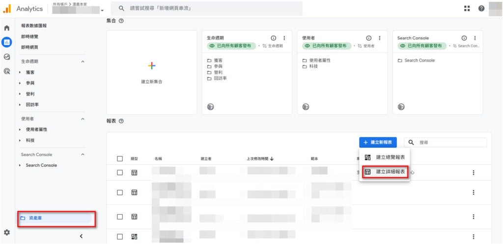 (一)讀者可以先到報表選單下方的「資產庫」,按下「建立新報表」按鈕,選擇「建立詳細報表」,如圖一所示。