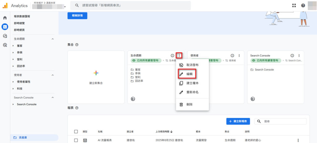 (六)我們還必須將AI 流量報表納入報表選單,這樣後續才能查看。在資產庫的「生命週期」集合,按下右上角三個黑點,然後選取編輯,如圖七所示。