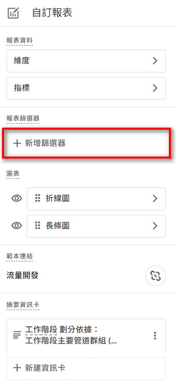 (三)選擇流量開發後,進入「自訂報表」的畫面,然後按下「新建篩選器」,如圖三所示。
