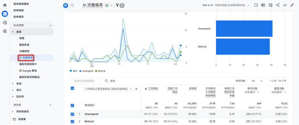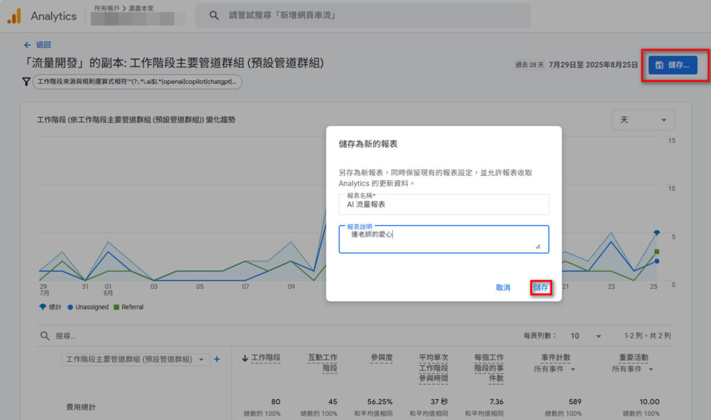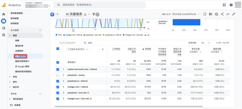 在完成自訂集合編輯後,我們就可在報表選單上看見AI 流量報表,如圖九所示。