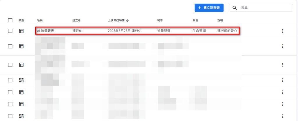 在完成上述步驟後,可以在「資產庫」的工作區畫面看到我們建立的「AI 流量報表」,如圖六所示。