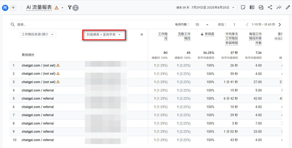 (二)可以使用次用維度查看進一步資訊,例如在次要維度選取「到達網頁+查詢字串」,即可查看AI 流量到底是從哪些到達頁上站,意即哪些與我們網站相關的主題內容是使用者有興趣而我們又被AI 引用摘要,如圖十一所示。