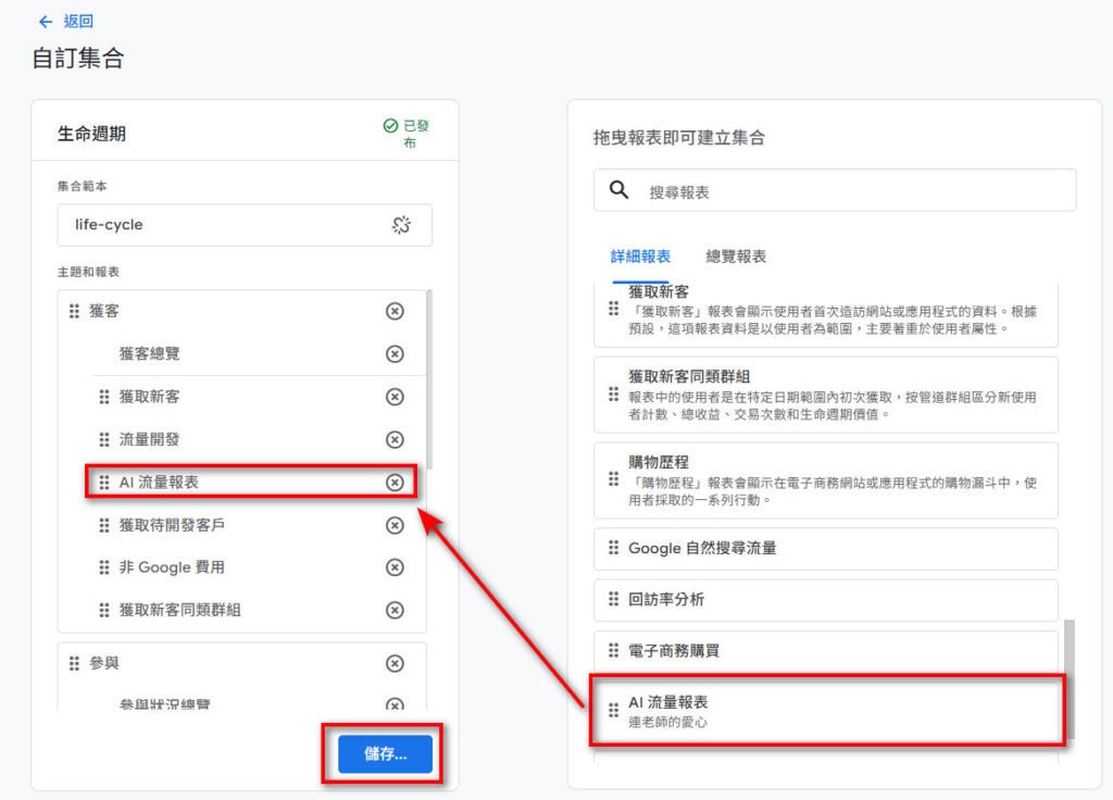 (七)在「自訂集合」畫面中,從右方的「詳細報表」中找到先前建立的「AI 流量報表」,將它拖曳到左方的主題和報表,然後按下「儲存」即可,如圖八所示。