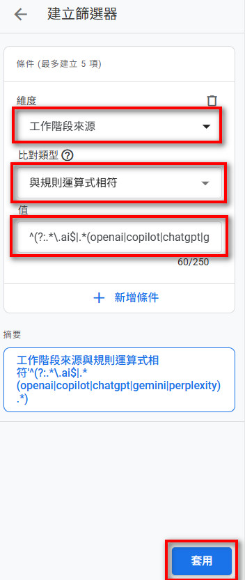 (四)在「建立篩選器」畫面中,維度選擇「工作階段來源」,比對類型選擇「與規則運算式相符」,在「值」的欄位填入以下規則運算式:
